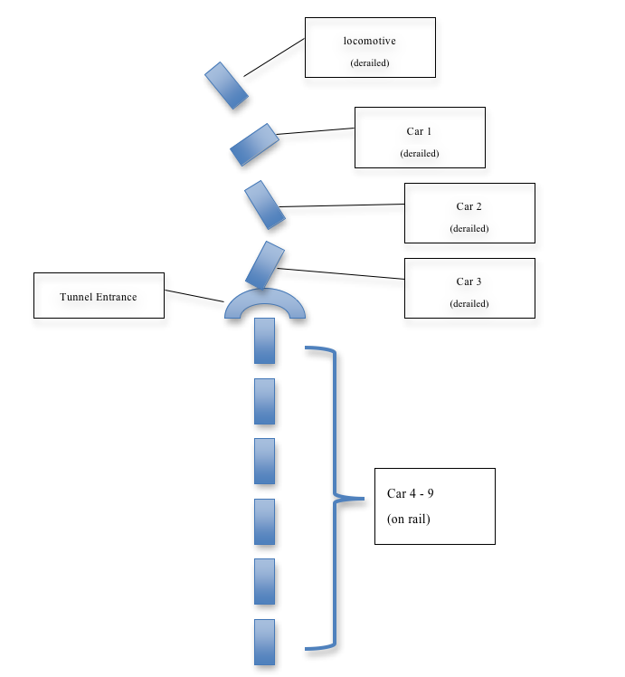 Before you actually write your report, you should start by analysing the incident in detail. Below, you’ll find a diagram that shows the position of a train and its carriages after a derailment. The table below this provides the basic facts and details that you will need in order to to write an incident report about the accident.