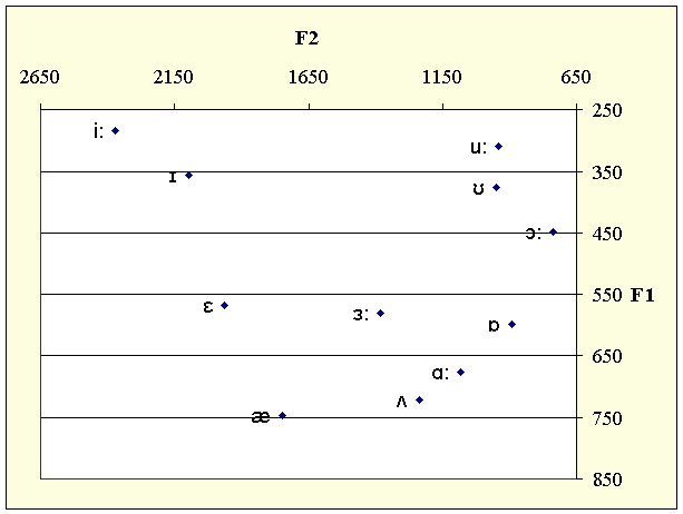 The following illustration, based on an adapted version of John Wells’ table of mean formant values of RP, relates formant values to positions within an imaginary vowel chart. Please note that in order to establish this connection, the scales for the x- and y-axes actually need to be inverted, an idea that I took from Peter Ladefoged’s excellent introduction to vowels in his book Vowels and Consonants.